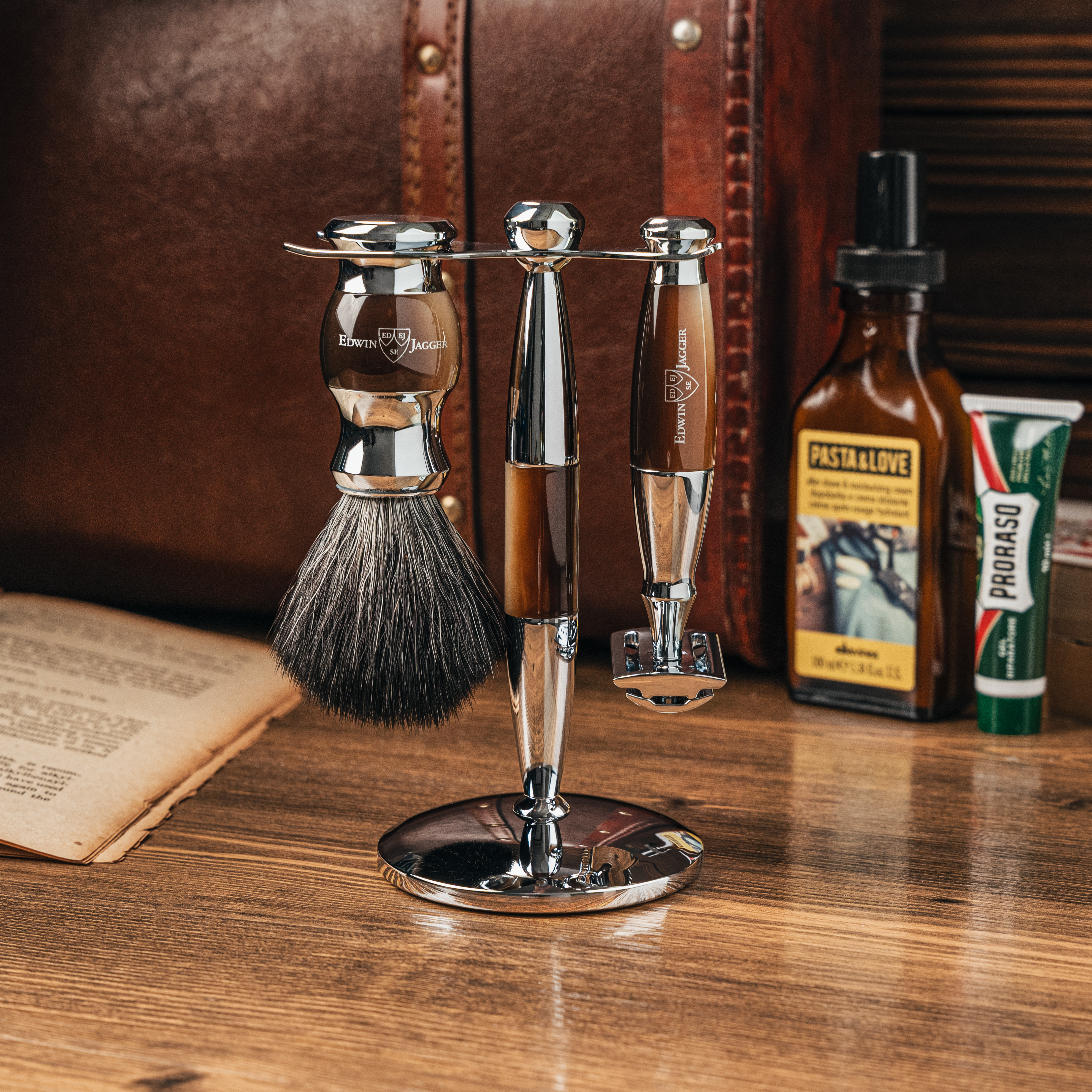 Edwin Jagger 牛角質感電鍍設計 3件傳統剃鬚套裝禮盒