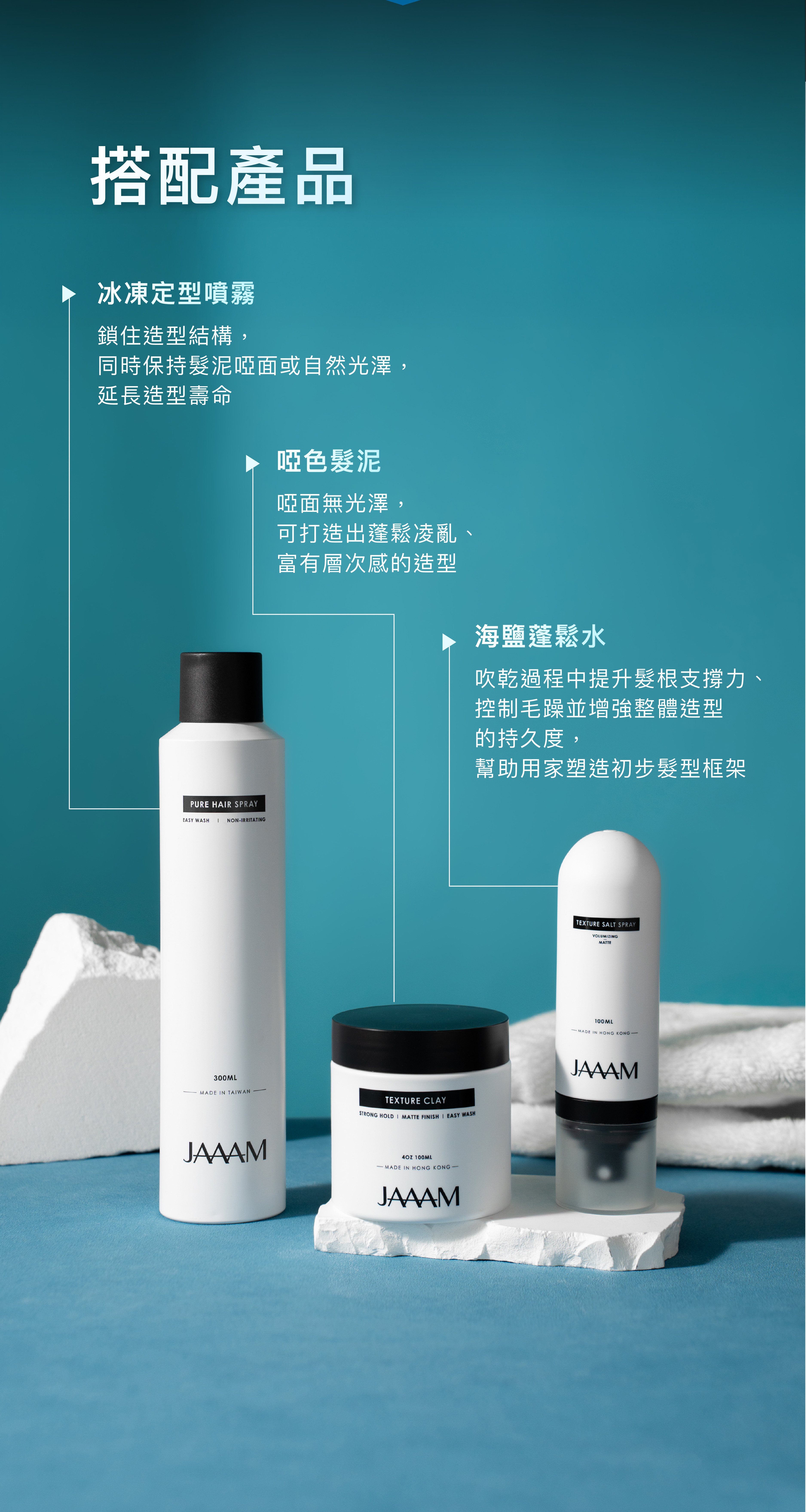 三部曲:打底產品為髮根注入空氣感、髮泥雕琢理想線條與質感,最後以冰凍定型噴霧鎖定造型