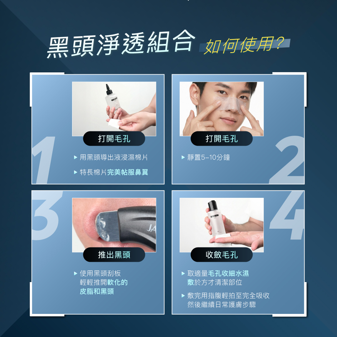 組合裝內含黑頭導出液x1、毛孔收細水x1、黑頭刮板x1、無紡紗棉片x1