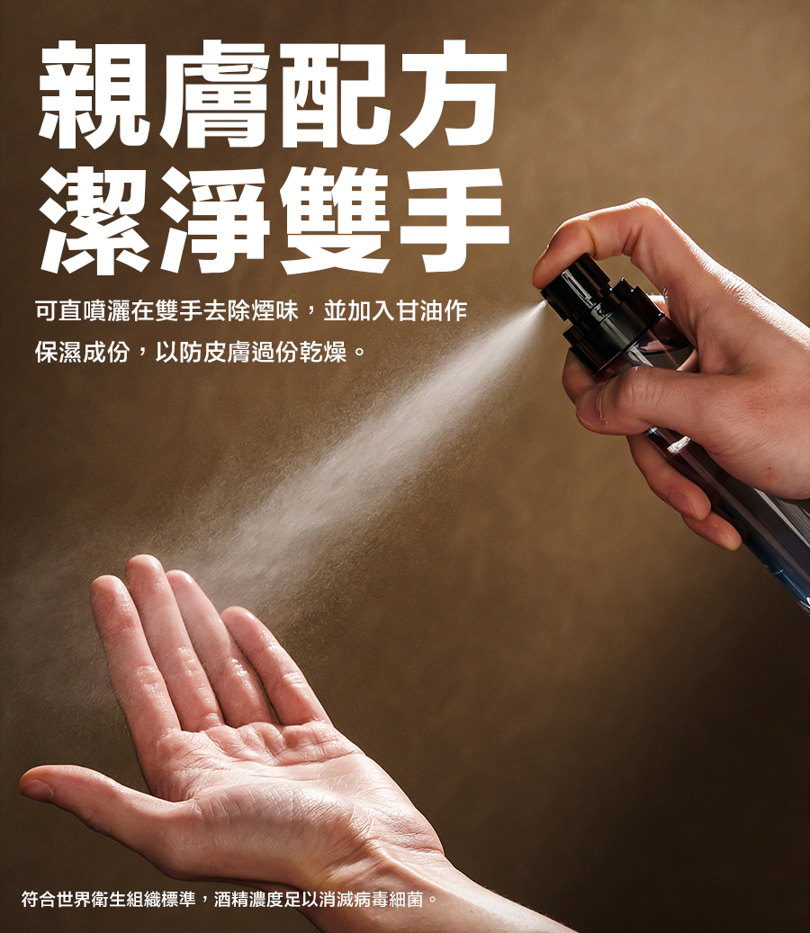 含60%酒精可直接噴在手上作消毒及除手指煙味用