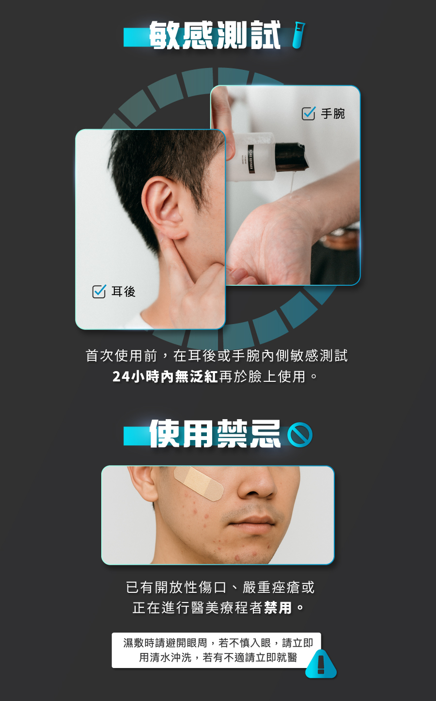 1) 如出現刺激、泛紅及痕癢等徵狀,請馬上停止使用及諮詢醫生意見。