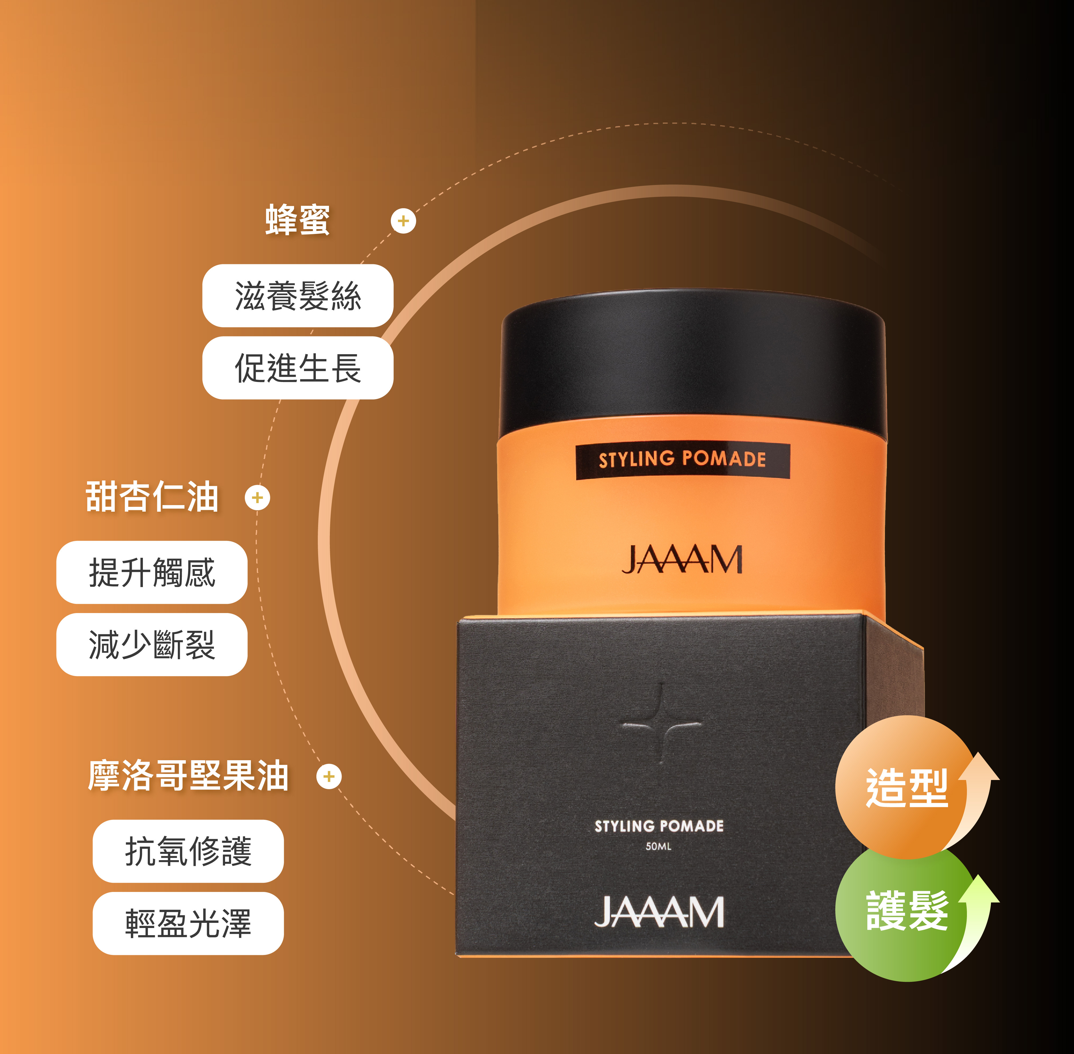 JAAAM亮澤髮油為頭髮添加亮麗的天然光澤,高效強力定型配方配合抗濕熱設計,提供全天候的持久定型效果,讓你一整天都能保持亮麗精緻的造型,不再為頭髮造型而煩惱。