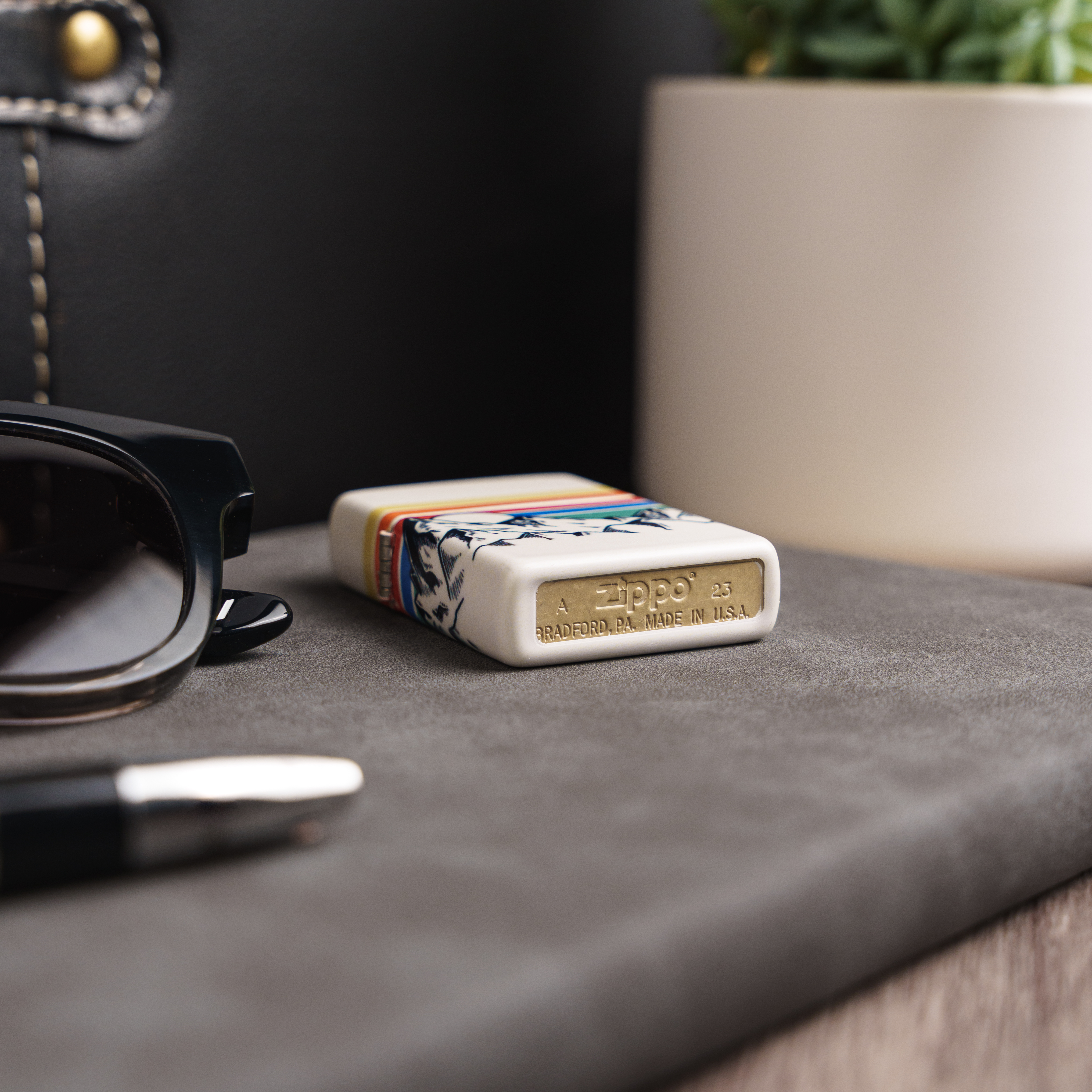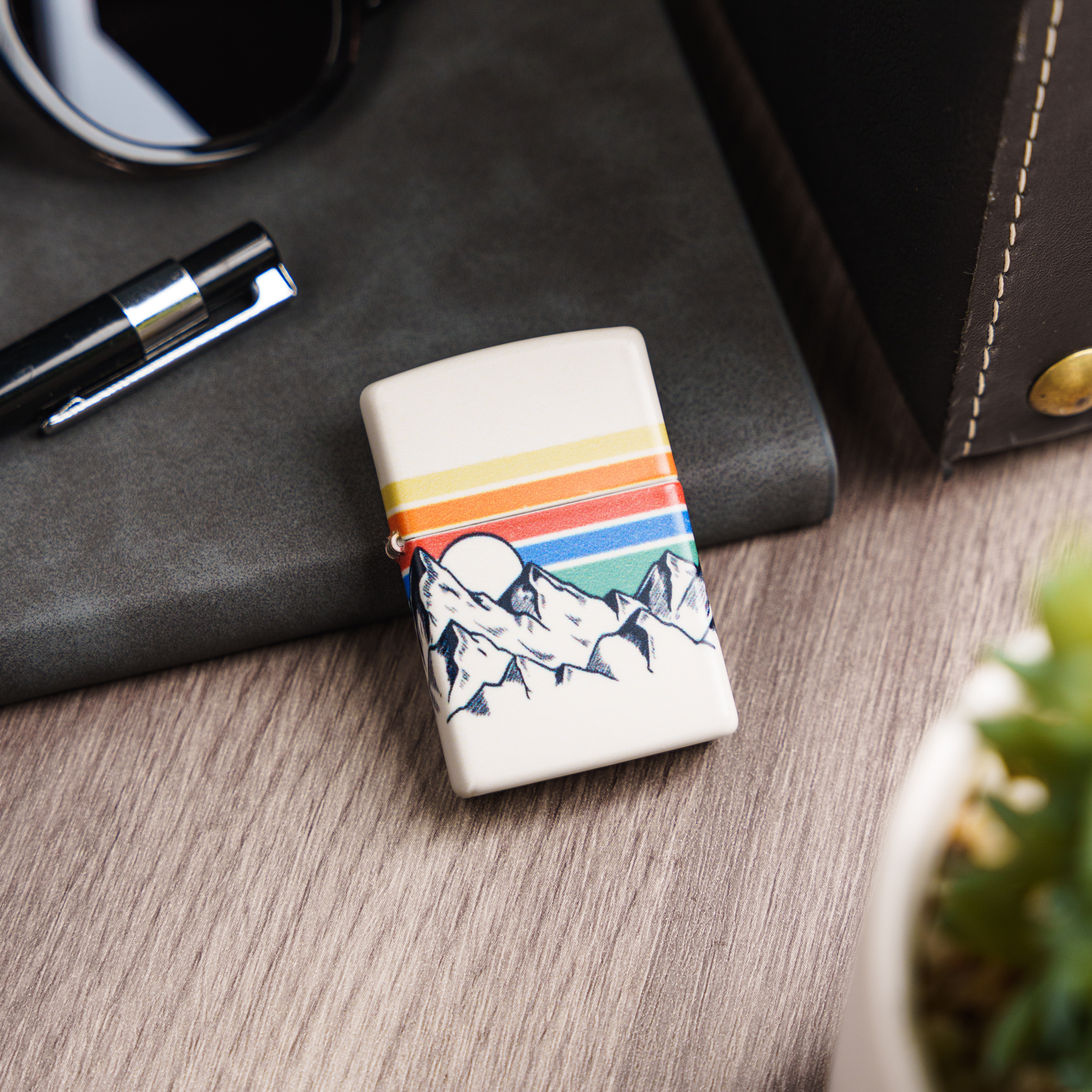 Take to the trails and wide open air with this modern and minimalist 540 Color lighter. The monochromatic mountainscape is backed by a colorblocked sunset in this serene design, which seamlessly covers all sides of this adventurous keepsake. Comes packaged in a gift box. For optimal performance, fill with Zippo lighter fuel.