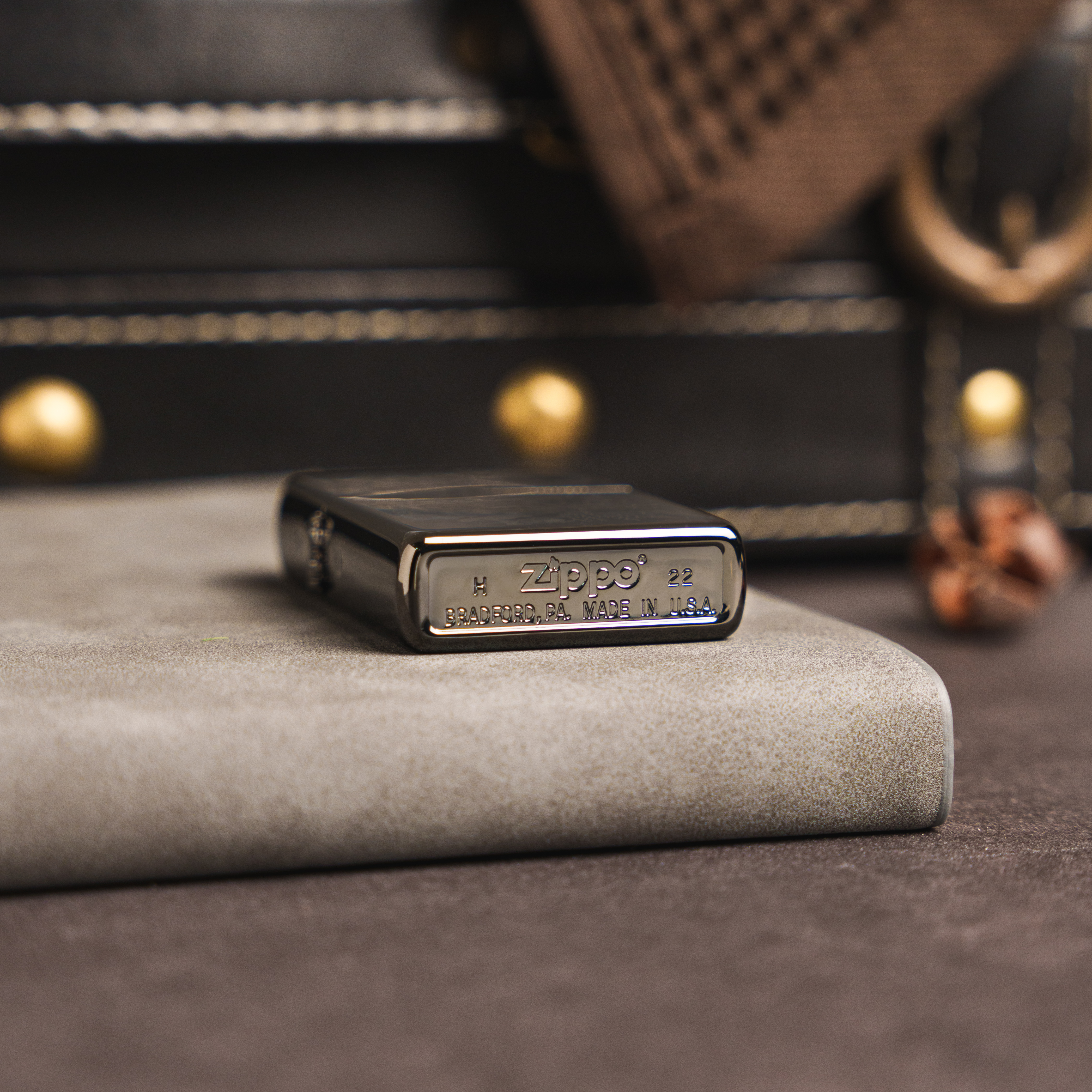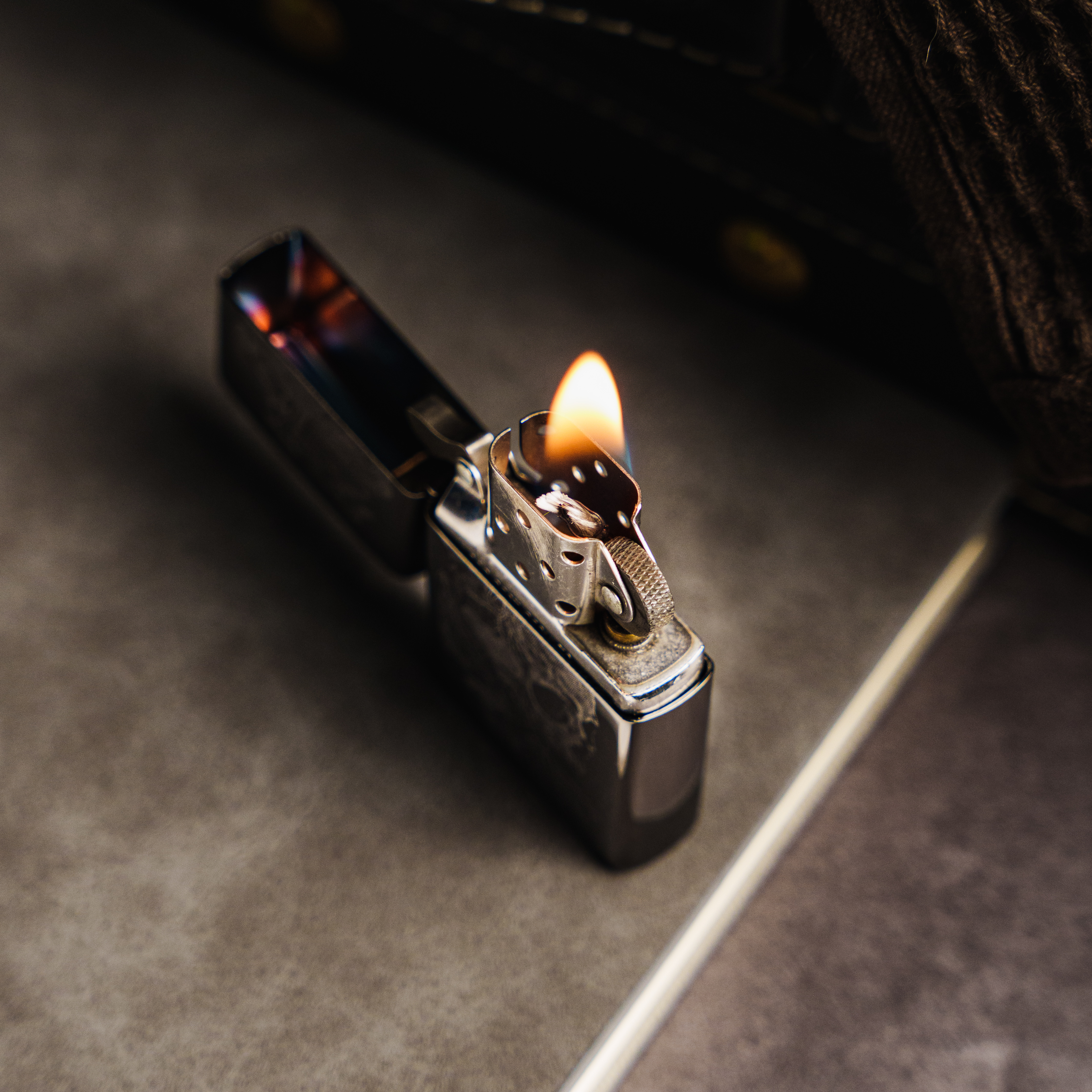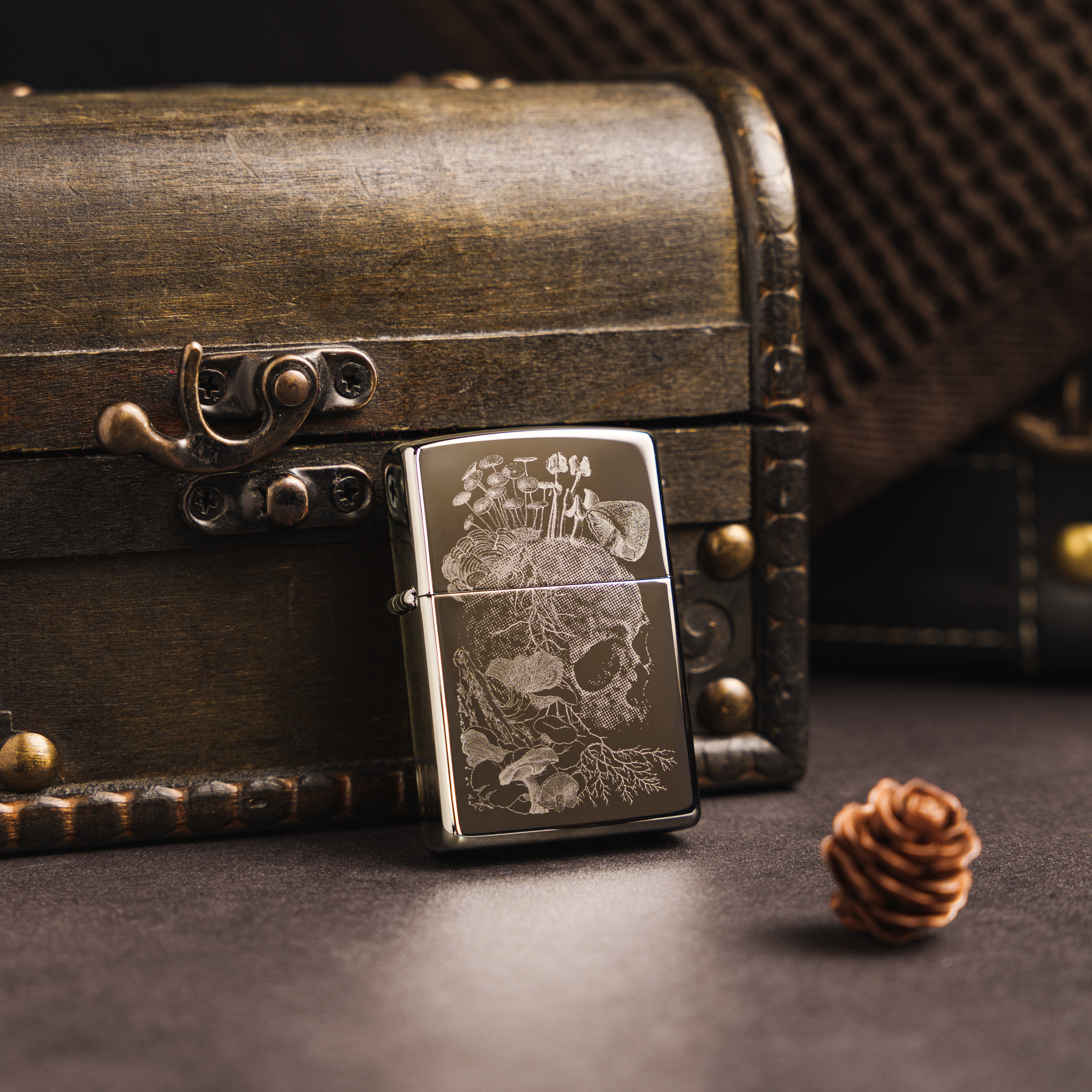 Life and death are romantically juxtaposed on this stunning High Polish Black lighter. The Photo Image design depicts a skull and mushrooms in intricate detail and plays seamlessly with the lustrous backdrop beneath. Comes packaged in a gift box. For optimal performance, fill with Zippo lighter fuel.