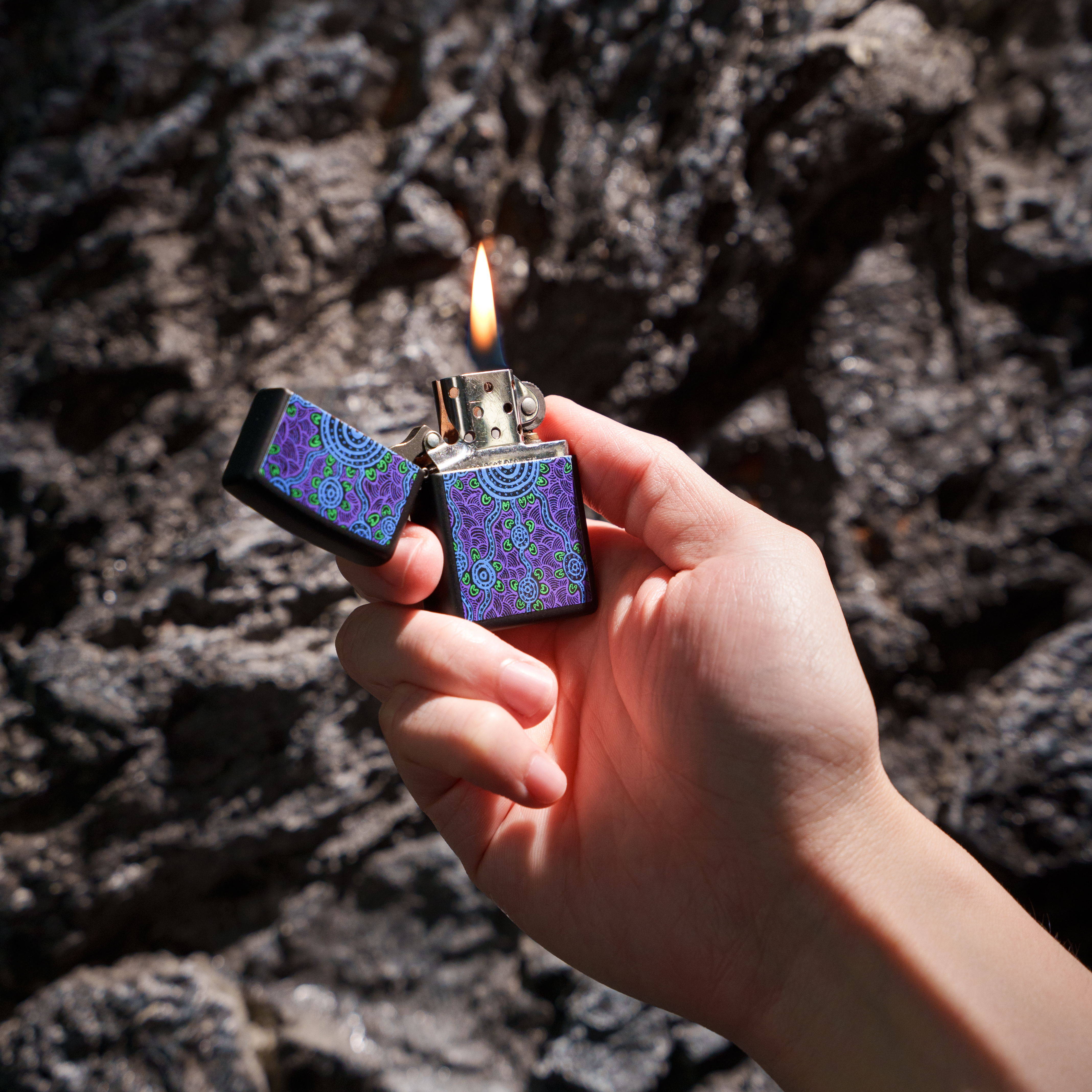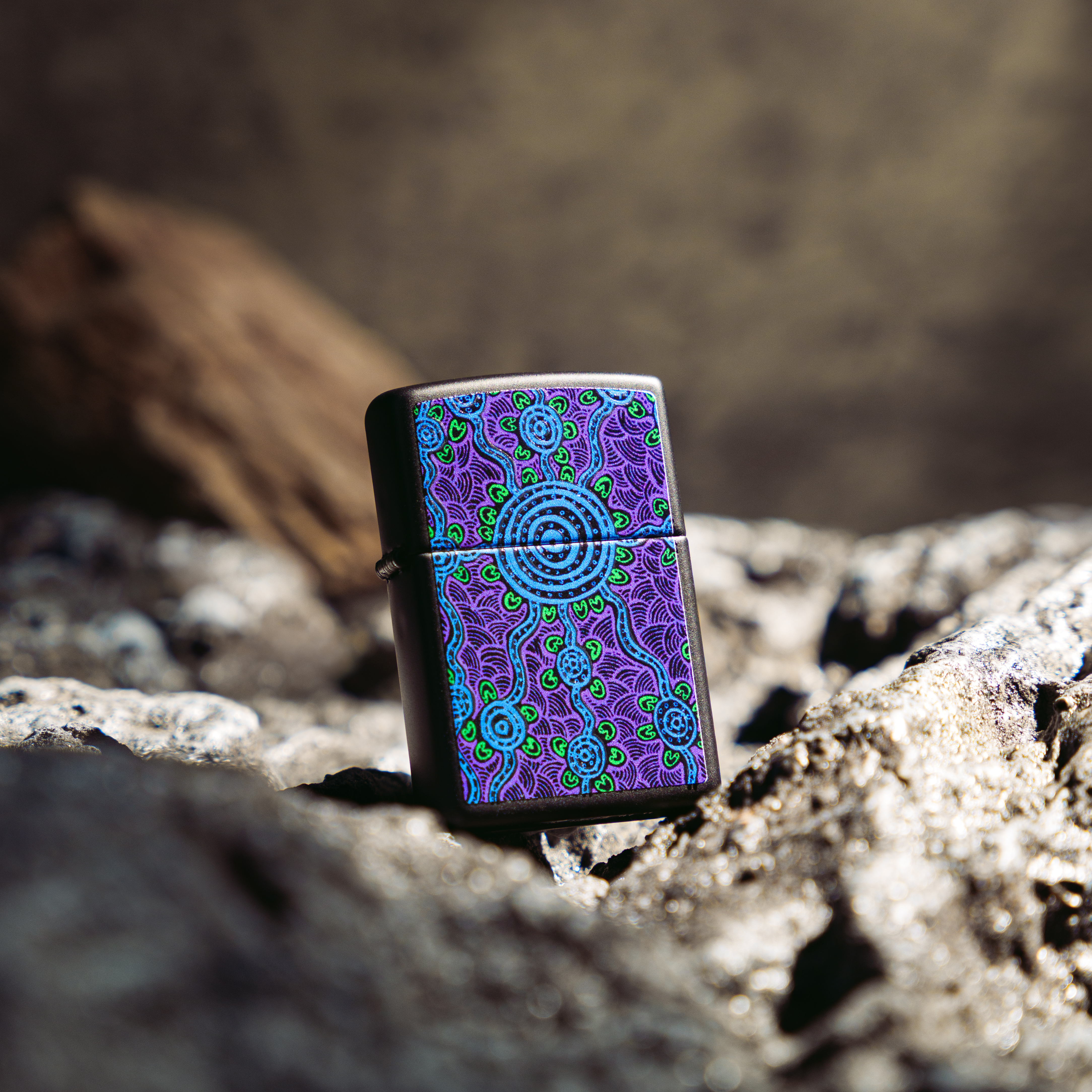 Inspired by the rich tones and vibrant colors of his culture and country, Australian Aboriginal artist and ambassador John Smith Gumbula has been passionate in the arts, cultural affairs and innovation for over 30 years. This classic Black Matte lighter features his iconic style in a mesmerizing Color Image design, which illuminates under ultraviolet light using our exclusive Black Light process. Comes packaged in a gift box. For optimal performance, fill with Zippo lighter fuel.