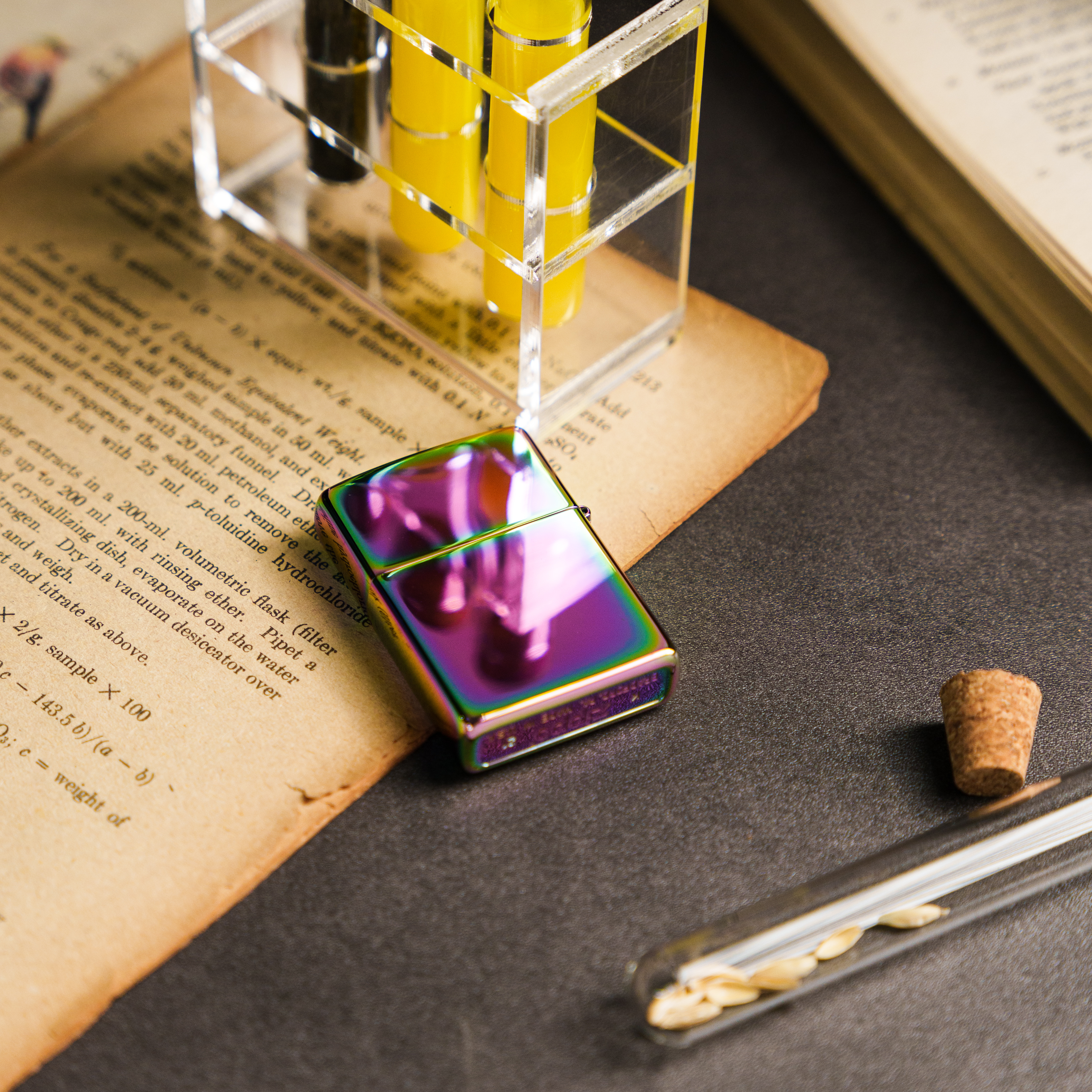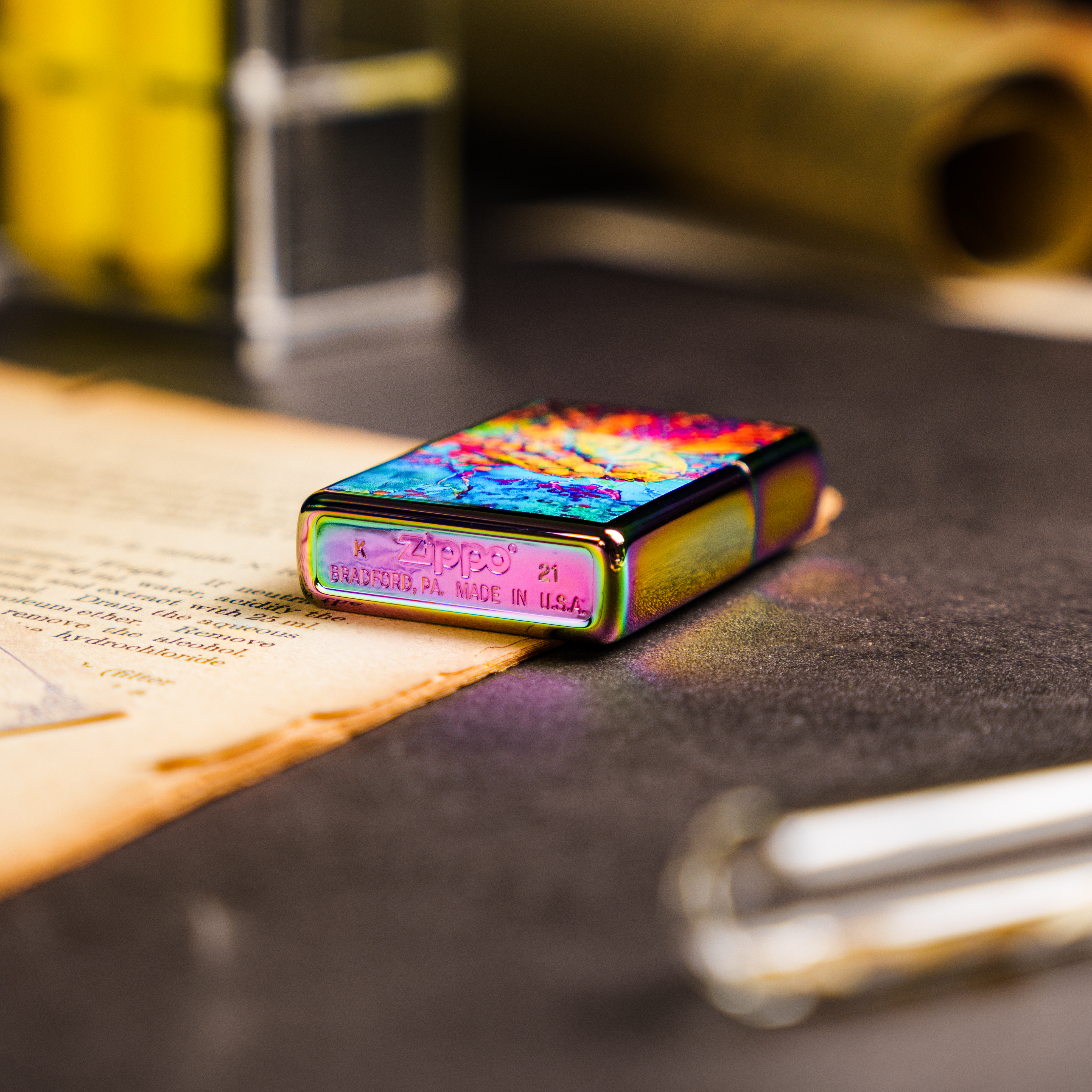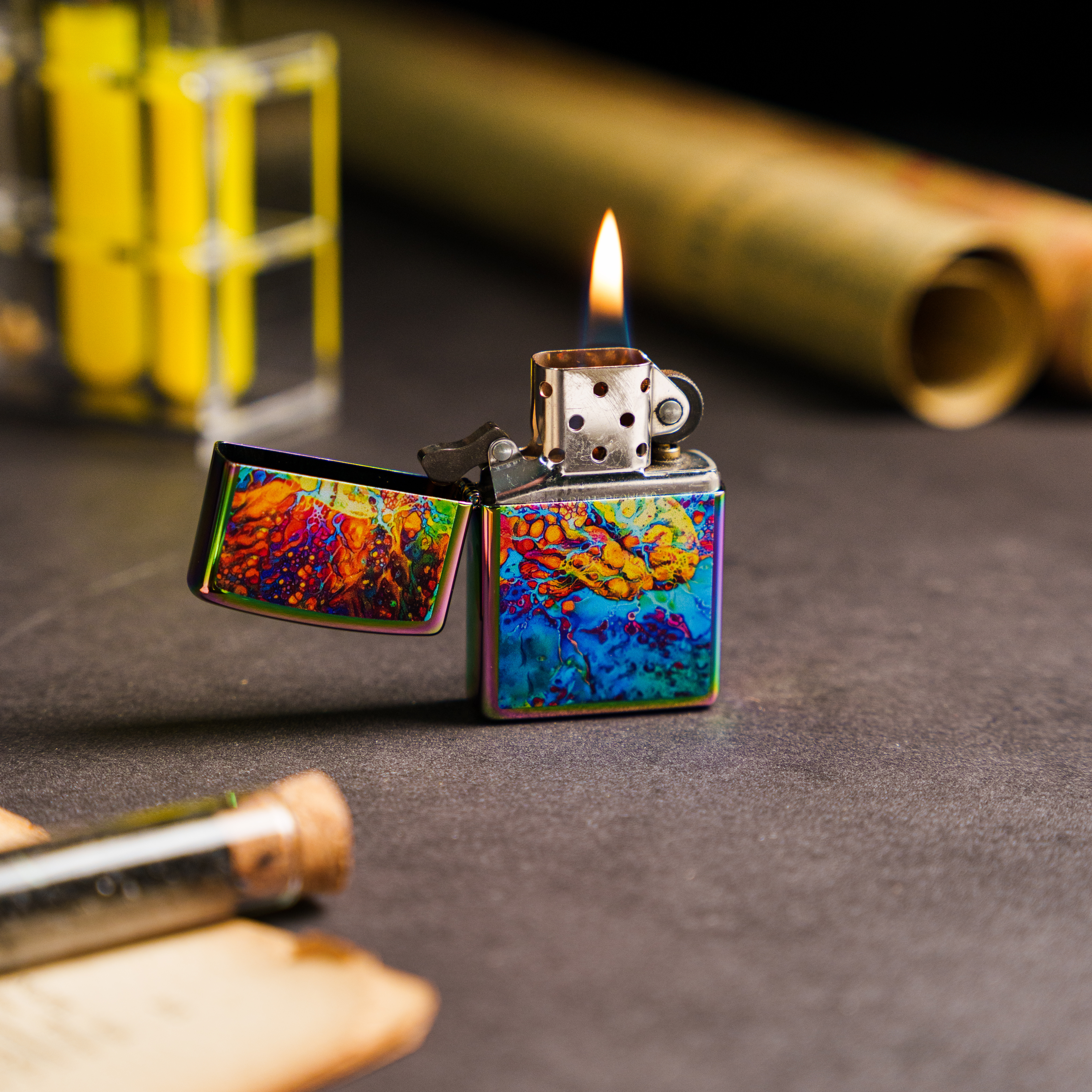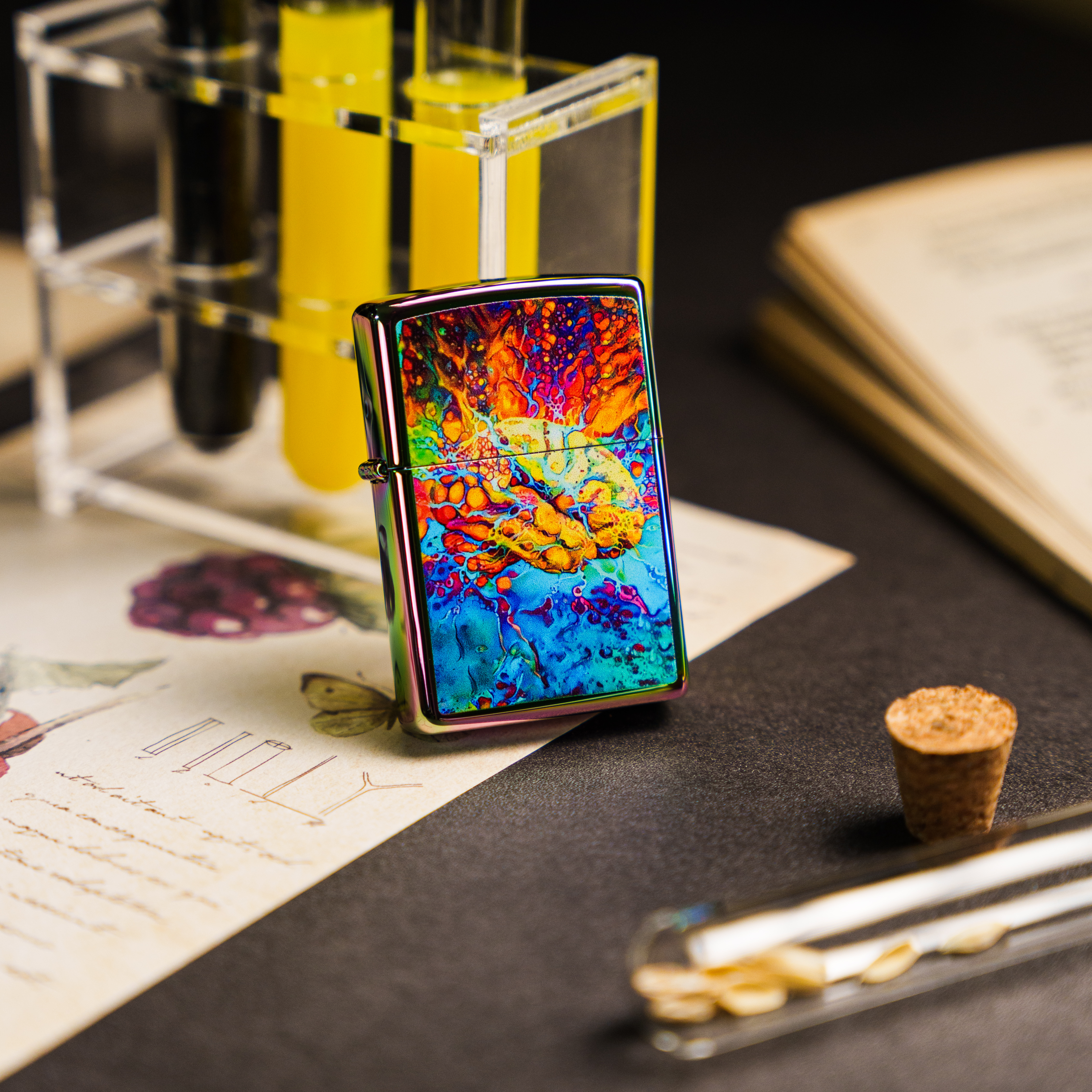 Get lost in the colors and reflections on this psychedelic Multi Color lighter. The iridescent background plays back and forth with the vibrant and detailed brain design that's achieved with our Color Image process. Comes packaged in a gift box. For optimal performance, fill with Zippo lighter fuel.