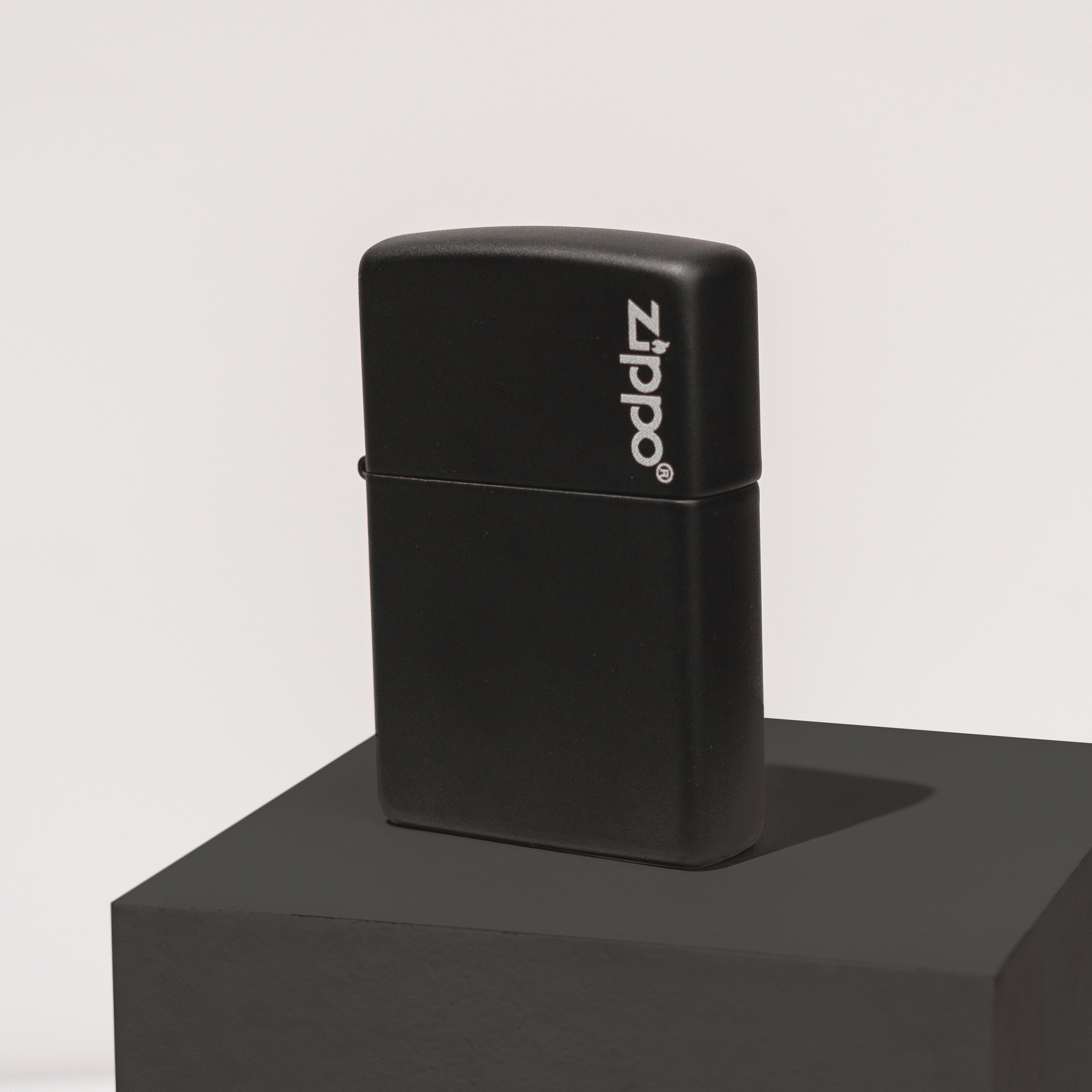 This black matte windproof lighter is adorned with the classic Zippo logo.
