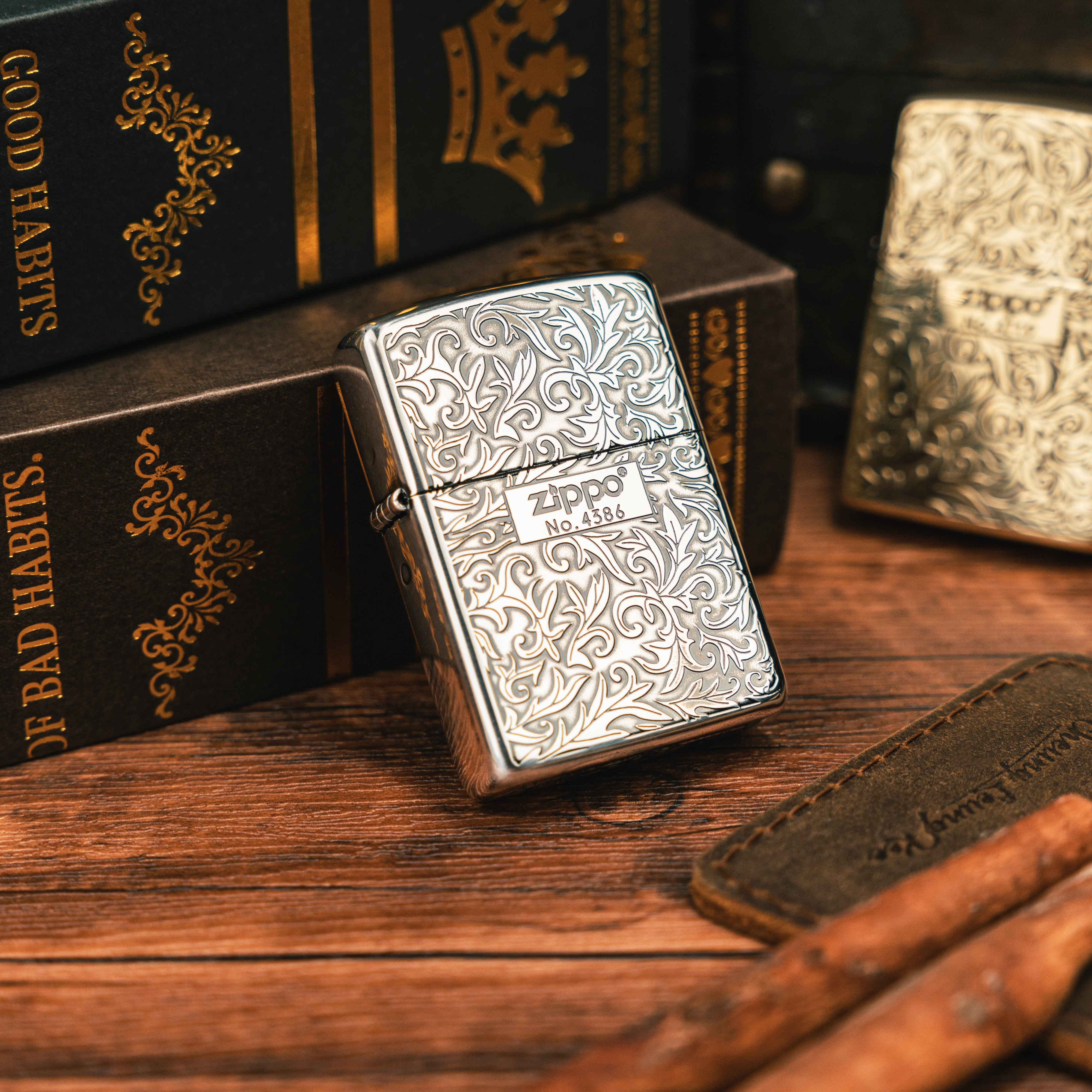 Zippo 日版 雙面加工唐草 打火機 (ZBT-3-19d) 銀色火機機身, 配以雙面加工唐草圖案