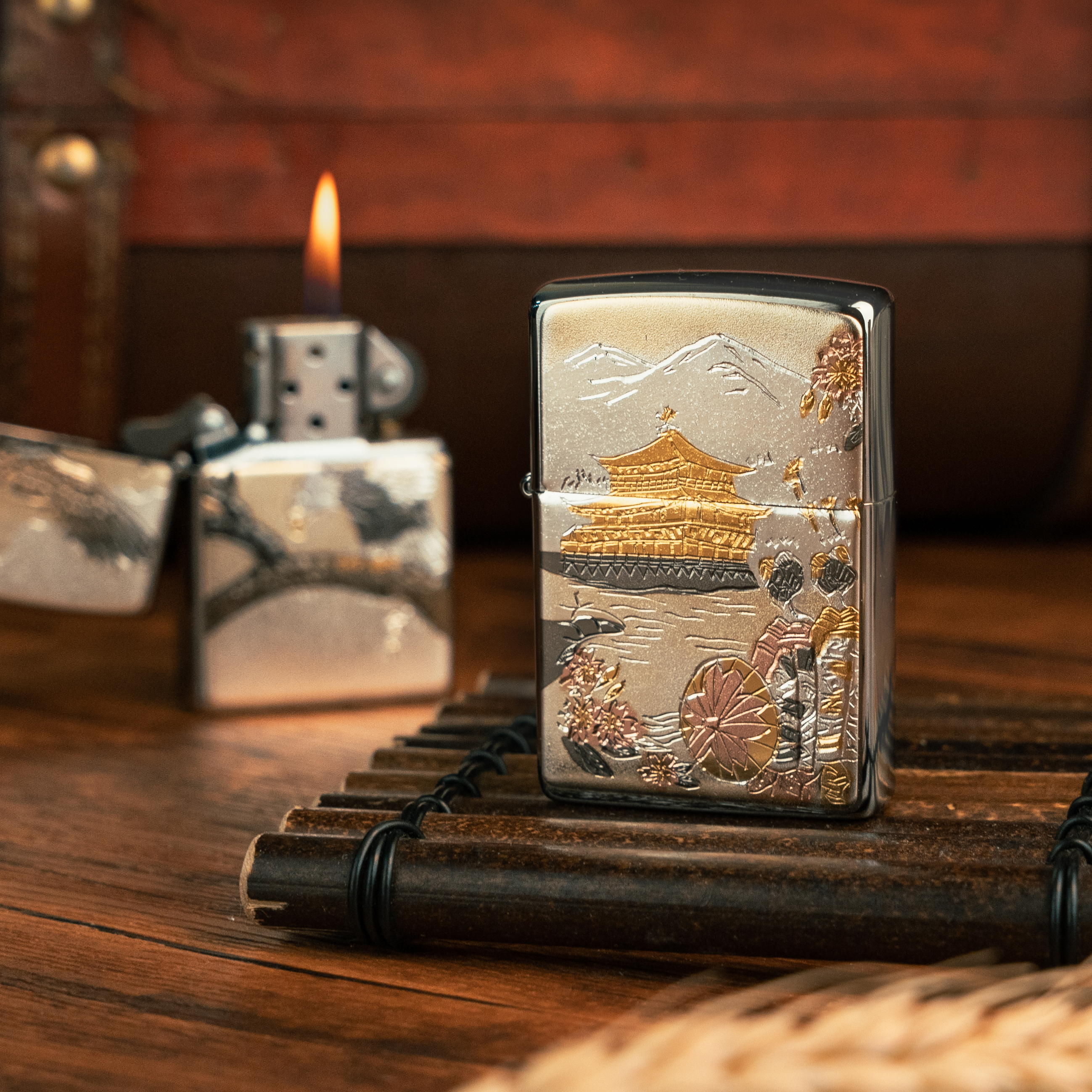 Zippo 日版 日本傳統金閣寺 ZBT-5-123銀色火機機身, 配以日本和式圖案, 日本傳統金閣寺