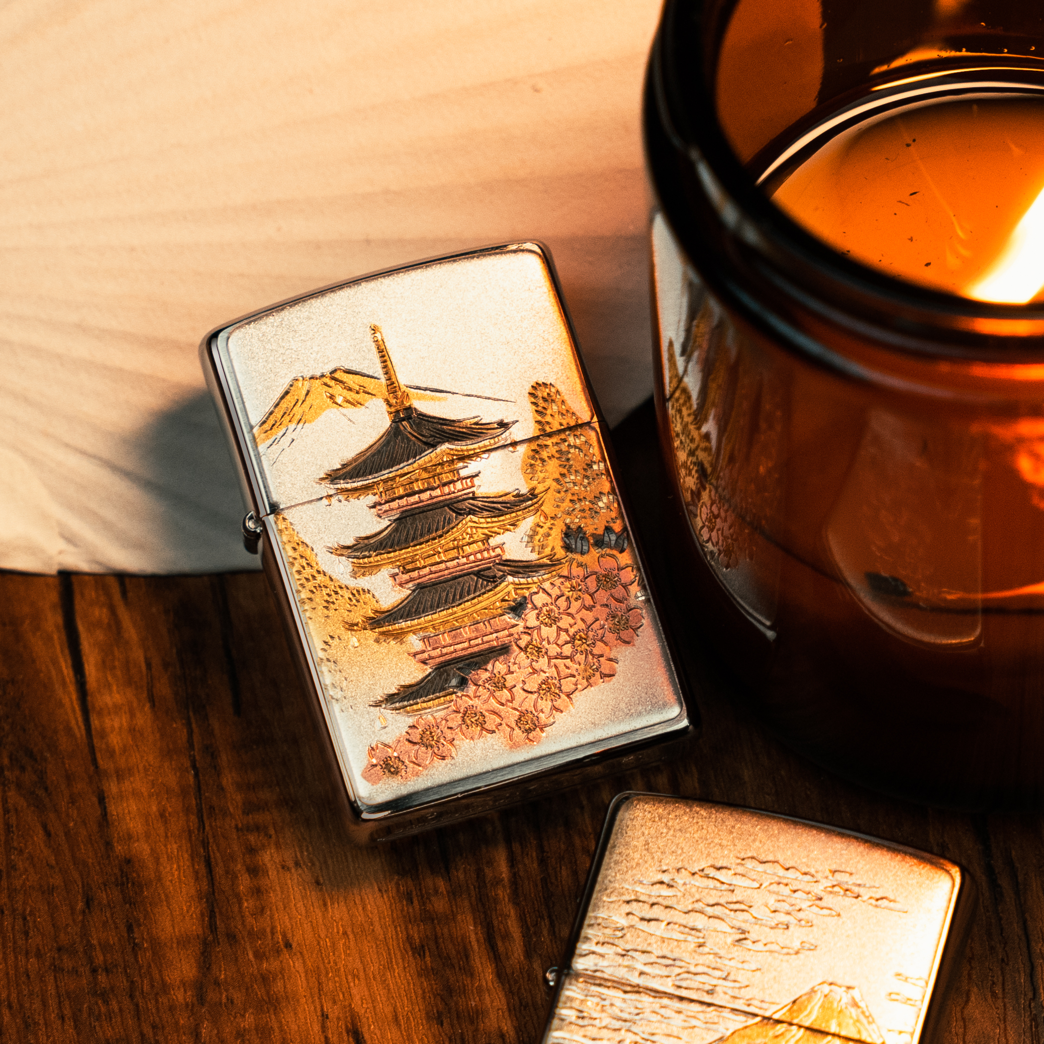 Zippo 銀色火機機身, 配以日本富士山塔圖案,
