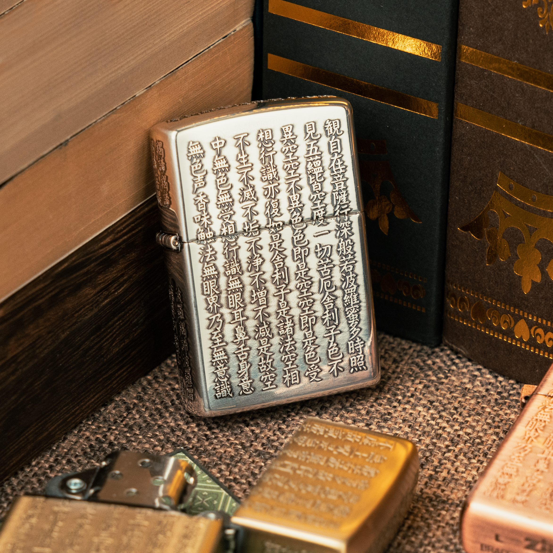 銀色火機機身, 配以心經突體Zippo , 360度五面包圍加工(除了火機底部)