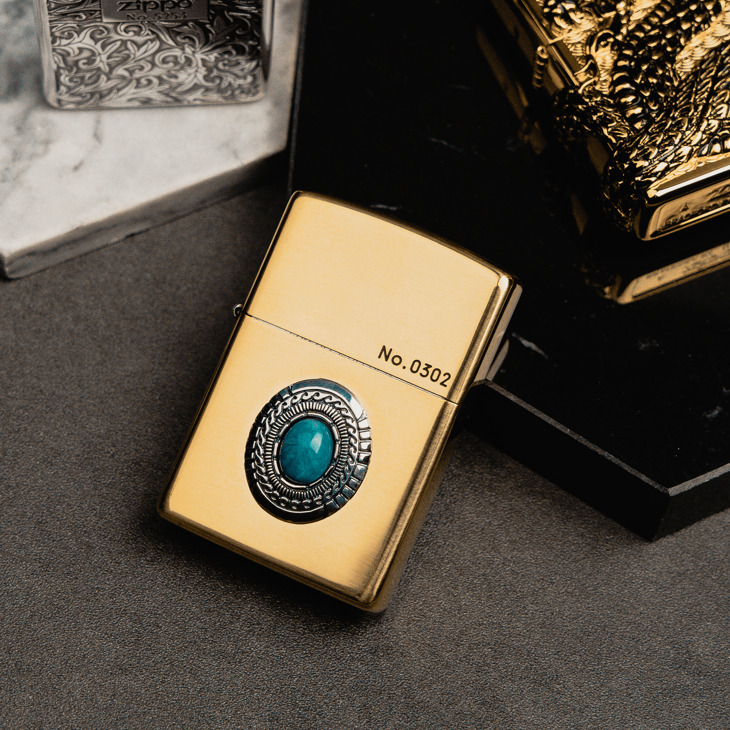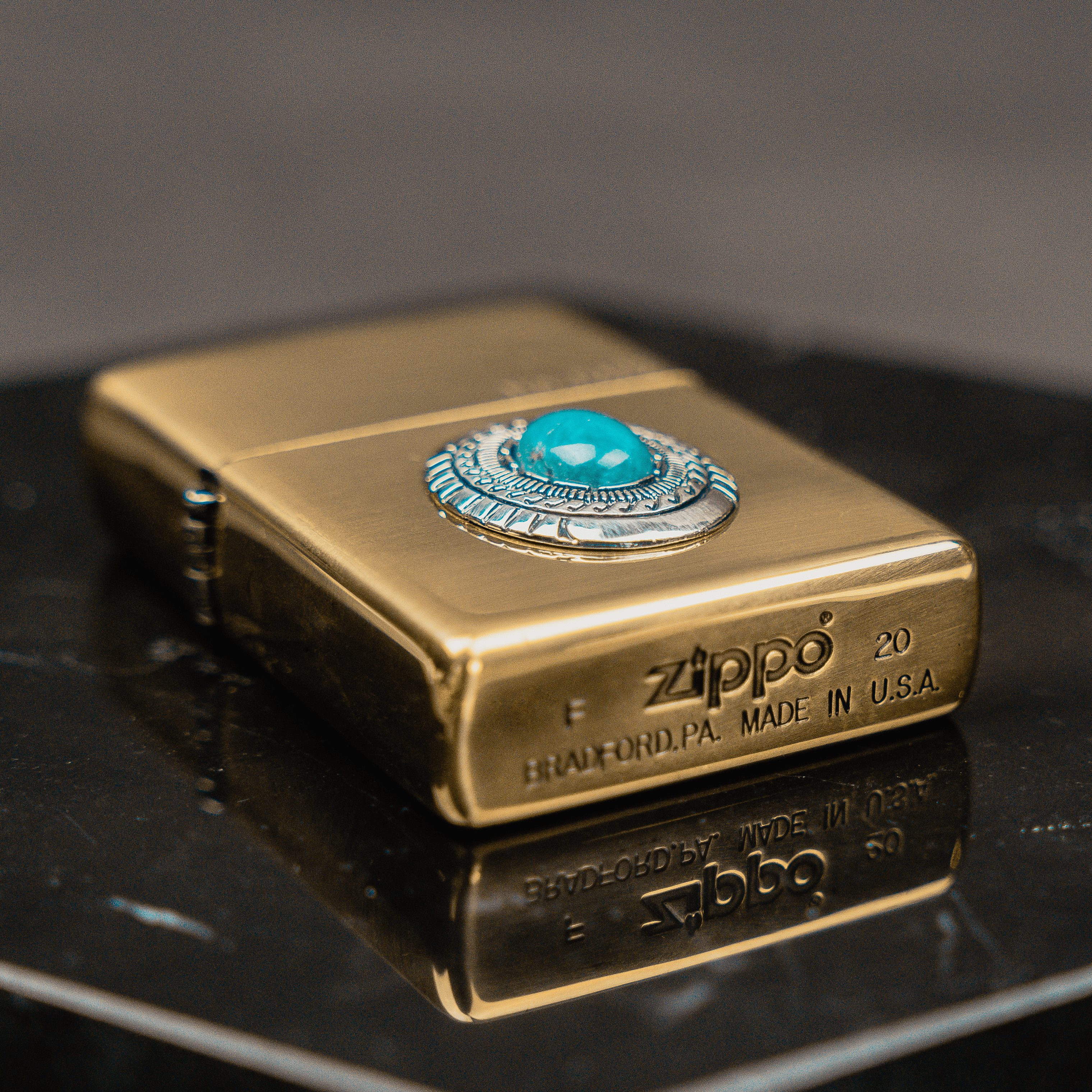 Zippo 金色火機機身, 配以經典麥花圖案, 中間鑲嵌綠松石.